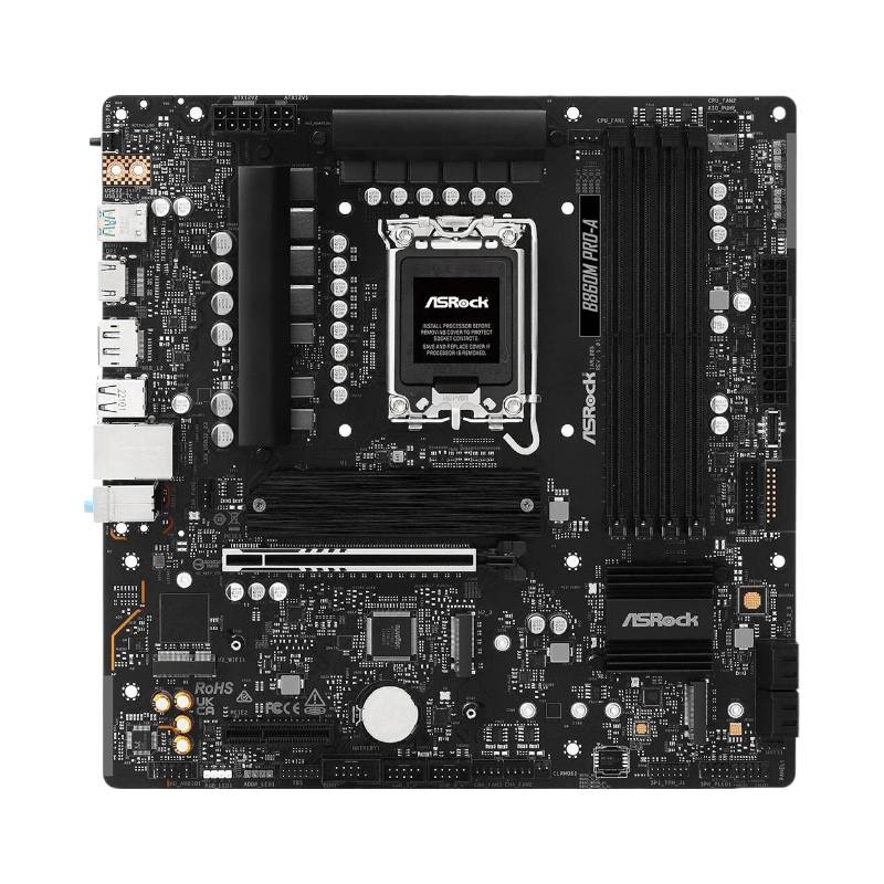 mATX, чипсет Intel B860, память 4xDDR5/DDR5 CUDIMM, слоты: 1xPCIe x16 5.0, 3xM.2, 802.11ax (Wi-Fi 6E)+Bluetooth 5.3, 10+1+1+1+1 фаз питания